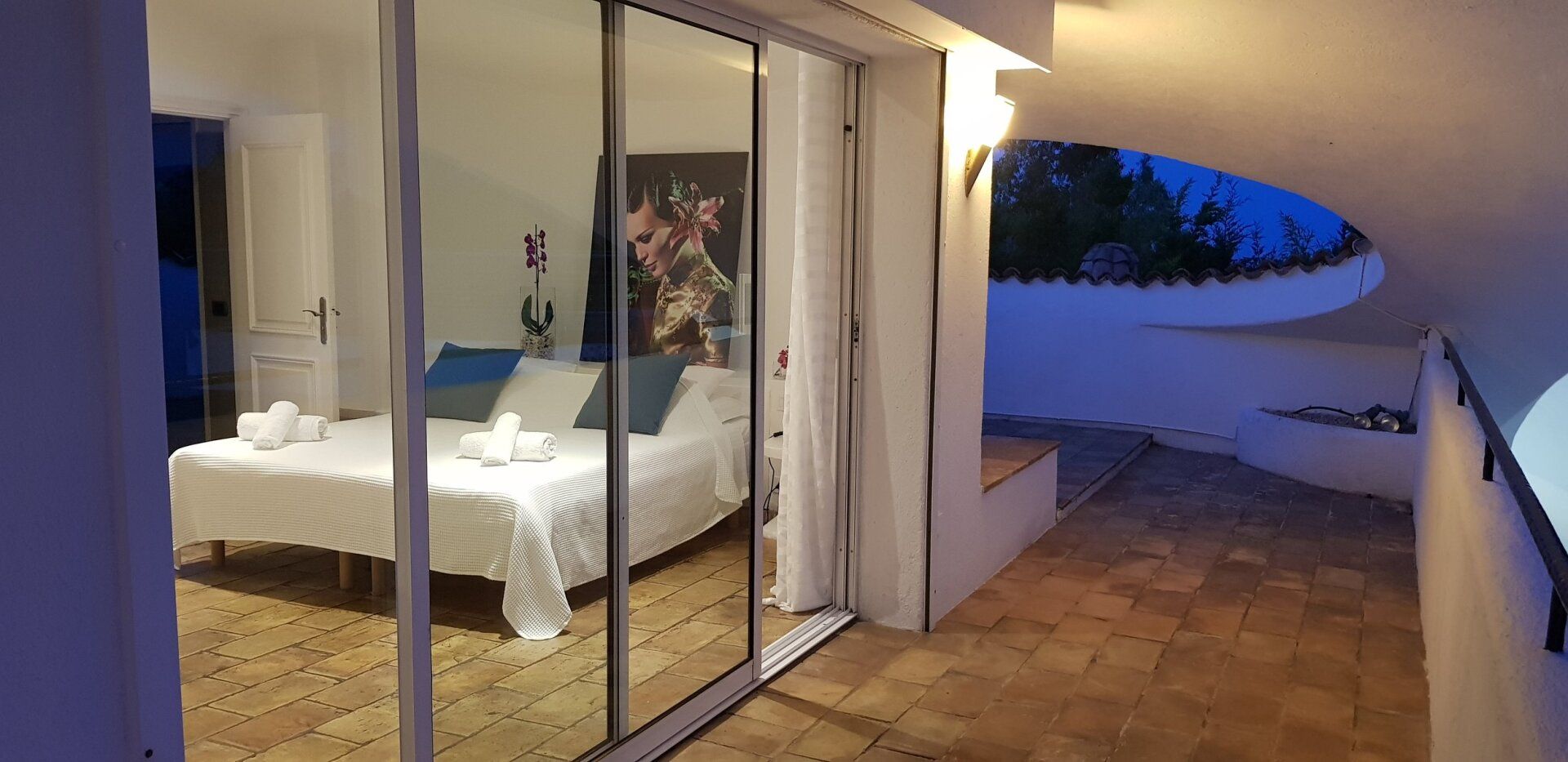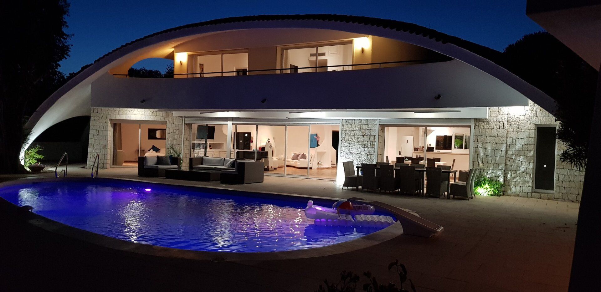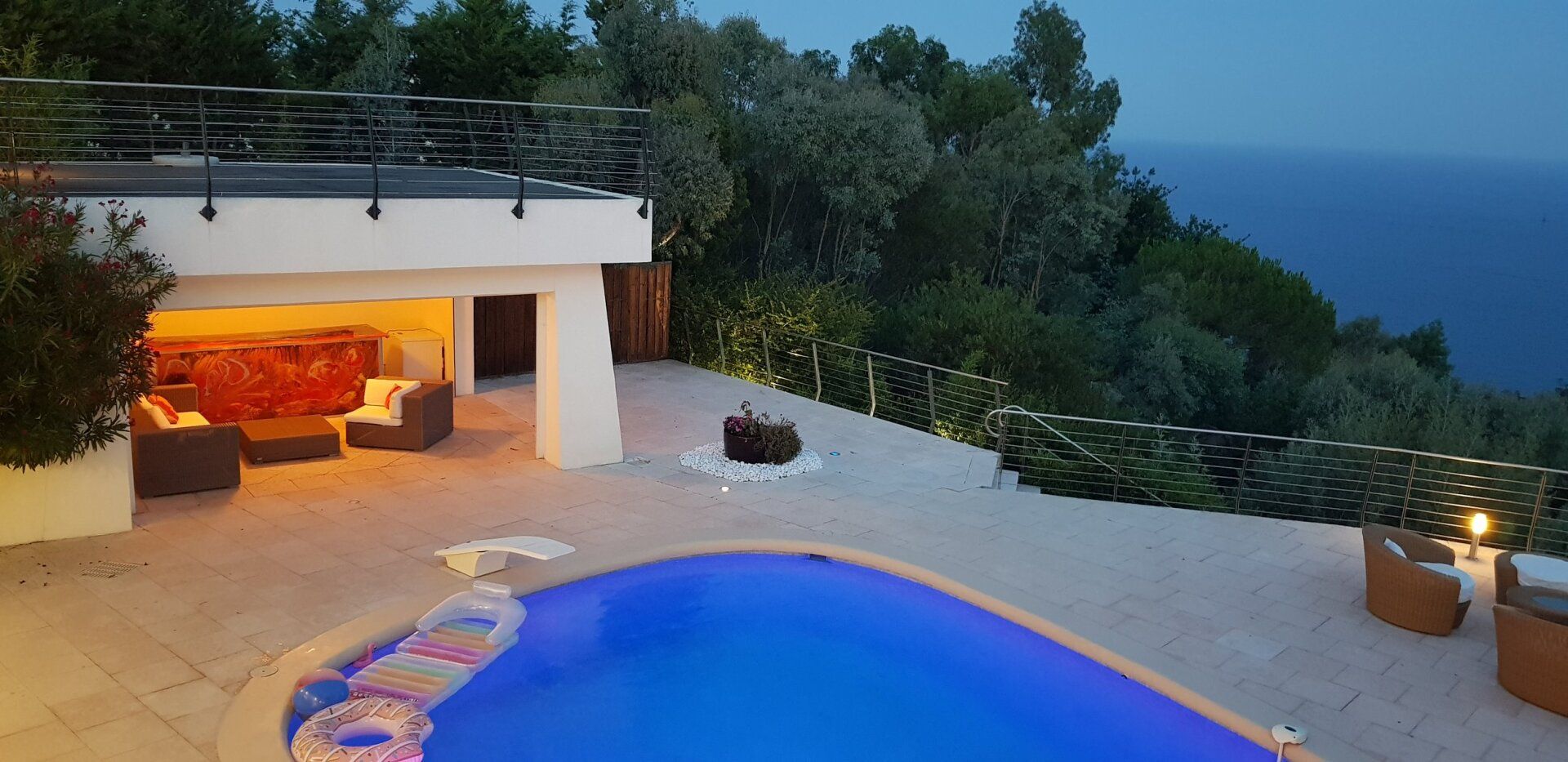 Villa Oxygene is located in beautiful, spacious enclosed grounds (3,900 m²) with a panoramic sea view. The villa has 450 m² of floor space and has 6 luxury bedrooms, a childrens room and a garden house. Four of the luxury bedrooms are equipped with indoor jacuzzi. The villa has wireless internet access, cable TV, a bar and an outdoor barbeque. There are three terraces with a total space of 330m² and in front of the house is located a large led lighted swimming pool. Next to the swimmingpool is a pool house equiped with a bar, fridges and freezers. The villa is elegant and designed to the last detail with high standard. An outdoor power station for professional equipment can also be found for your event.